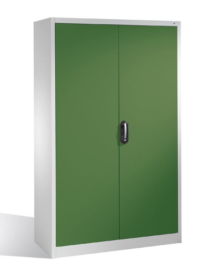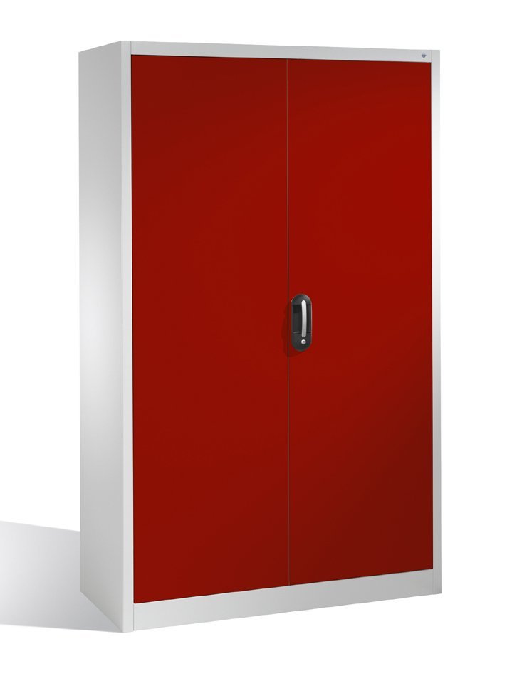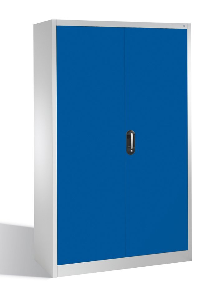 Dvojdverová dielenská skriňa, šírka 950, výška 1950, hĺbka 600 mm, 2 police. Možnosť náhrady plných dverí dverami so sklenenou alebo drôtenou výplňou. Farba korpusu RAL 7035 svetlosivá.