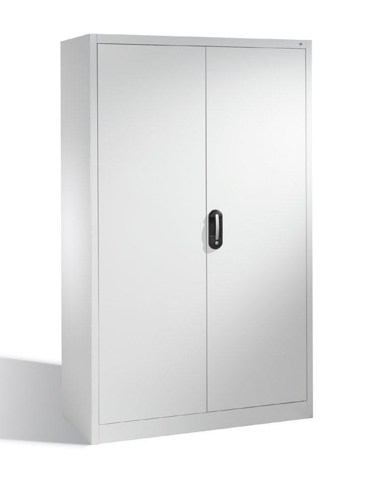 Skriňa s krídlovými dverami, 3x polica staviteľná po 25 mm (pozink), plné dvierka s výztuhami pre perfo, nosnosť 600 kg. Výška 1950 x šírka 1044 x hĺbka 405 mm.
