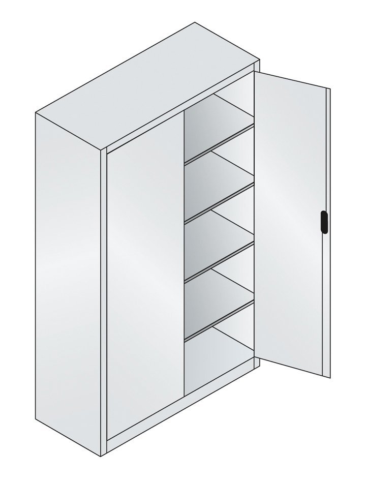 Dvojdverová dielenská skriňa, šírka 950, výška 1950, hĺbka 600 mm, 4 police. Možnosť náhrady plných dverí dverami so sklenenou alebo drôtenou výplňou. Farba korpusu RAL 7035 svetlosivá.