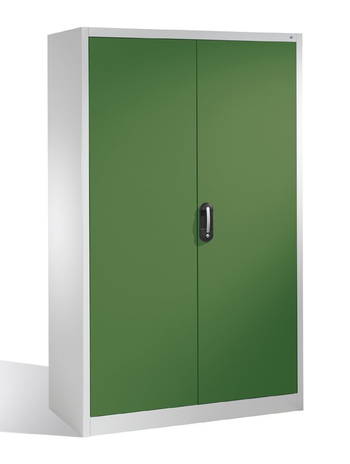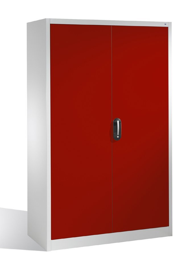 Skriňa s krídlovými dverami, 3x polica staviteľná po 25 mm (pozink), plné dvierka s výztuhami pre perfo, nosnosť 600 kg. Výška 1950 x šírka 1044 x hĺbka 405 mm.