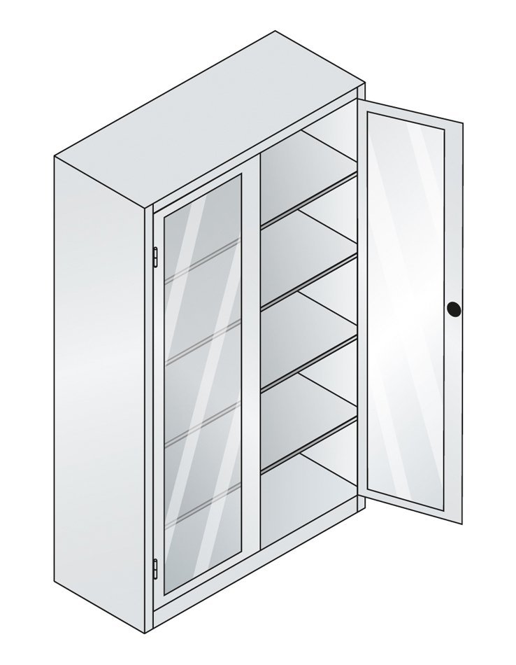 Skriňa so sklenenými dverami, výška 1150 x šírka 505 x hĺbka 400 mm. Zamykanie na cylindrický zámok s rozvorovým mechanizmom. 2 x staviteľná oceľová polica (nosnosť 60 kg). Sklenené dvere sú z tvrdeného skla. Možnosť náhrady dverí so sklenenou výplňou dverami s drôtenou výplňou alebo lamino dverami v odtieni buk, breza alebo čerešňa. Farba korpusu RAL 7035 svetlosivá.