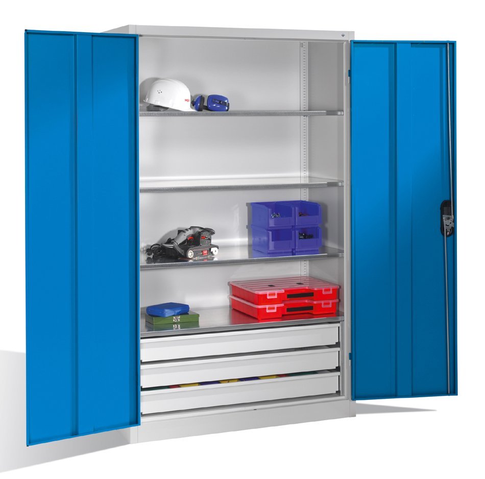 Dvojdverová dielenská skriňa s odolnou oceľovou konštrukciou. 6x prestaviteľná pozinkovaná police, nosnosť 70 kg/polica. Na ľavej i pravej strane 2 veľké zásuvky. Cylindrický bezpečnostný zámok s rukoväťou. Dostupné rozmery v mm (V x Š x H) 1950 x 930/1200 x 500.