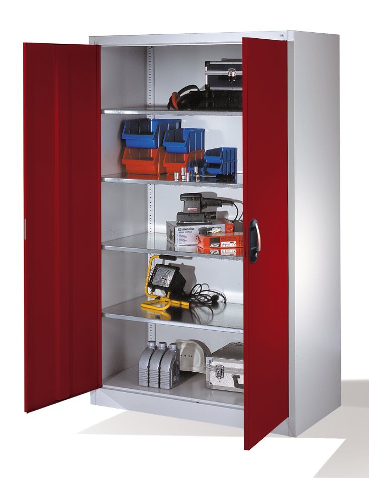 Skriňa s krídlovými dverami, 4x polica staviteľná po 25mm (pozink), plné dvierka s výztuhami pre perfo, nosnosť 600 kg. Výška 1950 x šírka 1044 x hĺbka 655 mm.