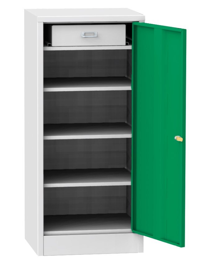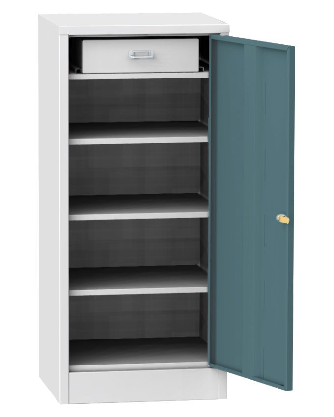 Dielenská skrinka na náradie, šírka 500, výška 1030, hĺbka 500 mm. Horná odkladacia plocha s gumovou podložkou a s okrajom proti prepadnutiu drobných predmetov. Farba korpusu RAL 7035 svetlosivá.