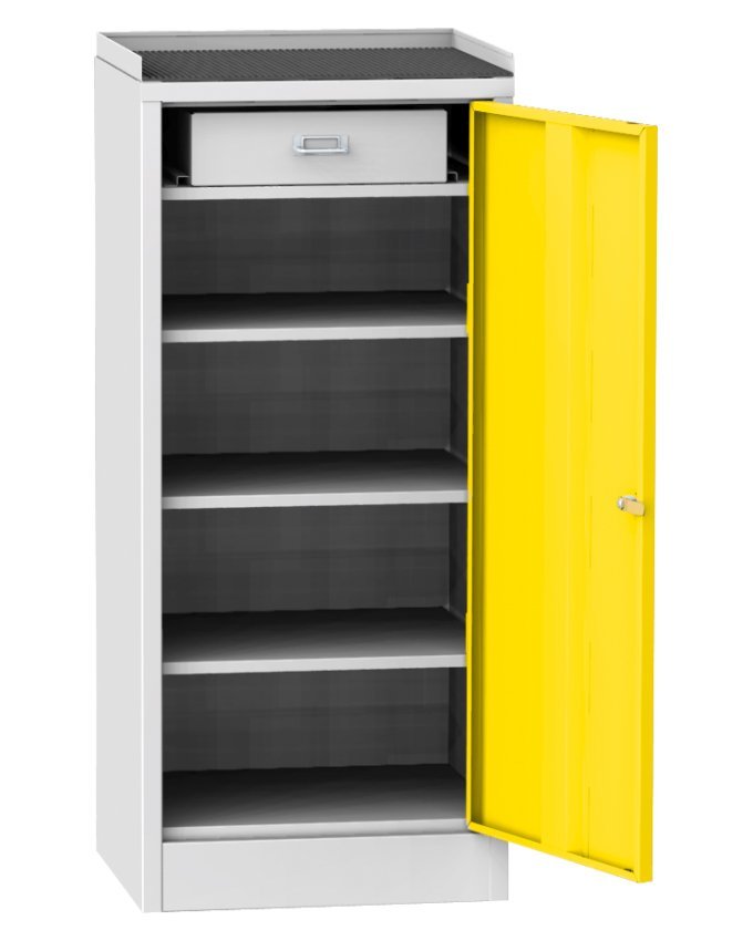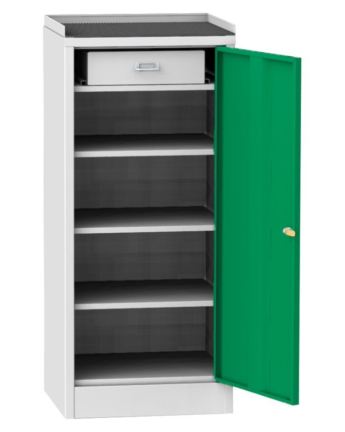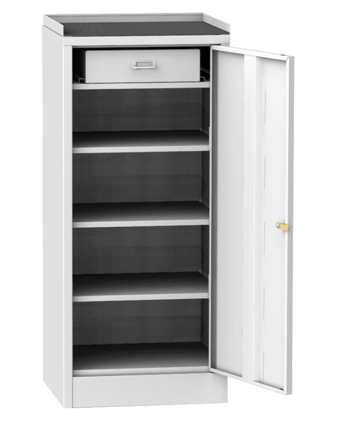 Dielenská skrinka na náradie, šírka 500, výška 1030, hĺbka 500 mm. Horná odkladacia plocha s gumovou podložkou a s okrajom proti prepadnutiu drobných predmetov. Farba korpusu RAL 7035 svetlosivá.