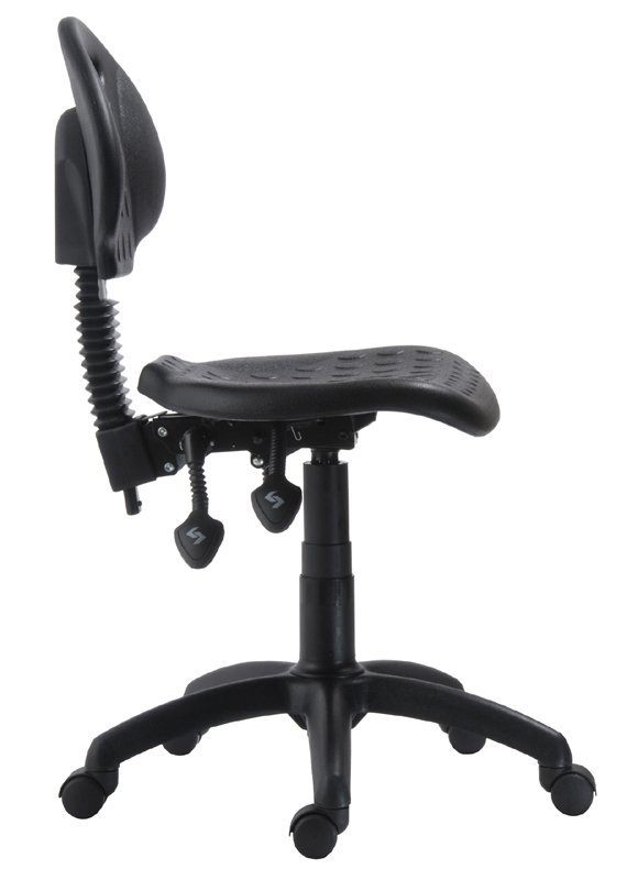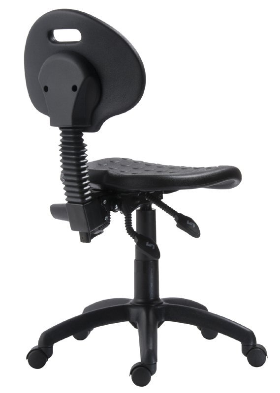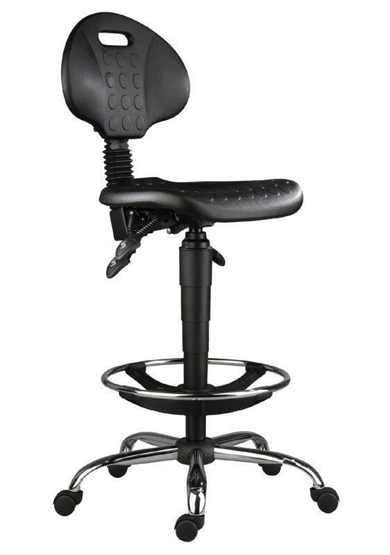 Polyuretanová dielenská stolička, nastaviteľny uhol operadla, nastaviteľná výška operadla a hĺbka sedáku, plynový piest. Kolieska alebo klzáky, možnosť zvýšeného sedenia s kruhovou oporou pre nohy. Kríž plast alebo chróm. Cena bez područiek.