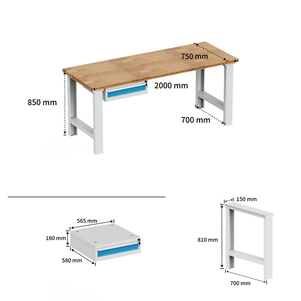 Pracovná doska 40 mm vodovzdorná buková škárovka. Noha výška 810, šírka 150, hĺbka 699 mm. Podvesný kontajner s tromi zásuvkami, výška 450, šírka 565, hĺbka 580 mm. Stôl má nosnosť 500 kg, výšku 850, šírku 1500, hĺbku 750 mm, farba konštrukcia svetlo šedá RAL 7035, farba zásuvky RAL 5012.