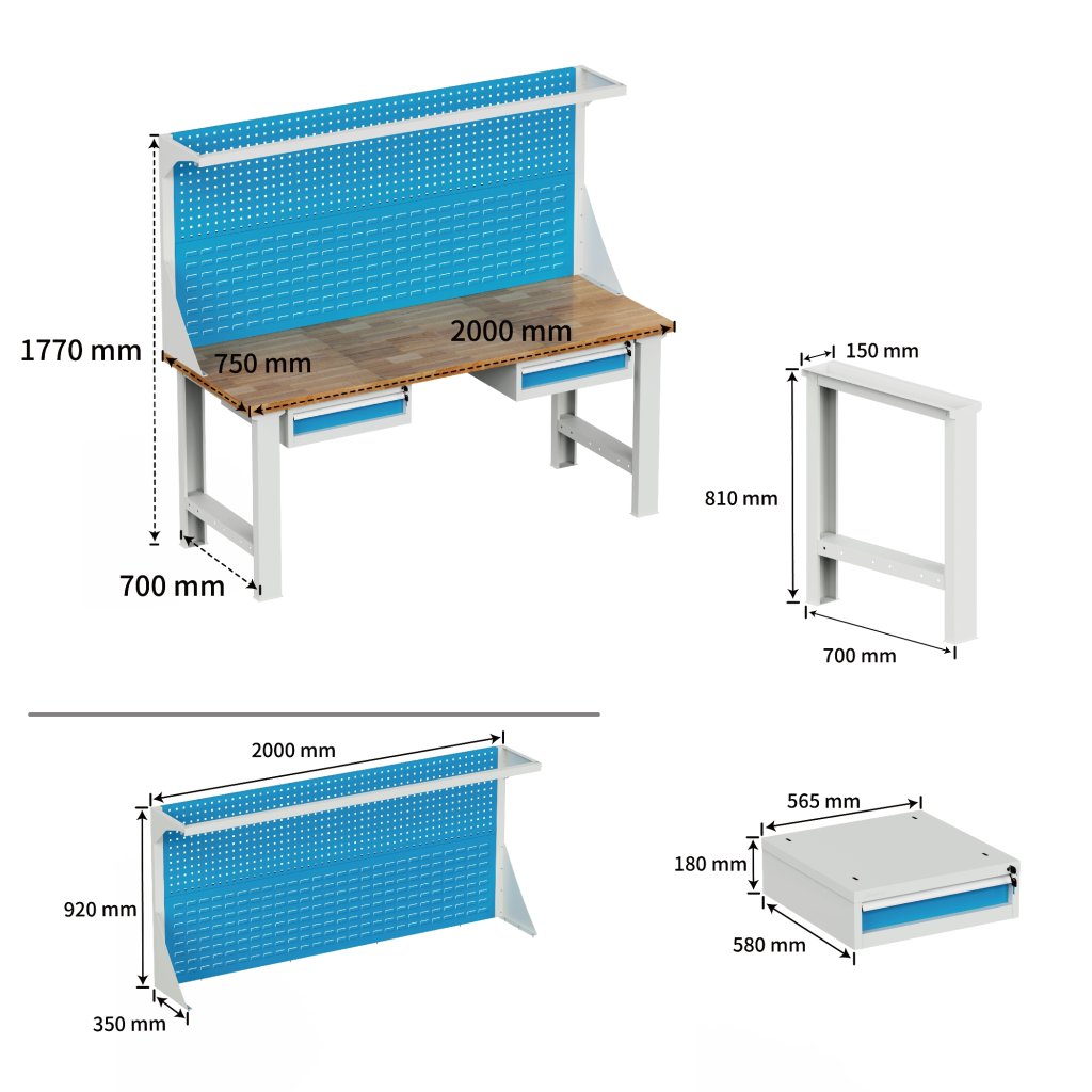 Pracovná doska 40 mm vodotesná buková špárka. Noha výška 810 mm, šírka 150 mm, hĺbka 699 mm. 2x podvesný kontajner výška 180 mm, šírka 565 mm, hĺbka 580 mm. Stolová nástavba s perfopanely výška 920 mm, šírka 2000 mm, hĺbka 350 mm. Nosnosť stola 500 kg, výška pracovnej dosky 850 mm, celková výška so nástavbou 1770 mm, šírka 2000 mm, hĺbka 750 mm. Farba konštrukcie svetlo šedá RAL 7035, farba zásuvky a perfopanelov modrá RAL 5012.