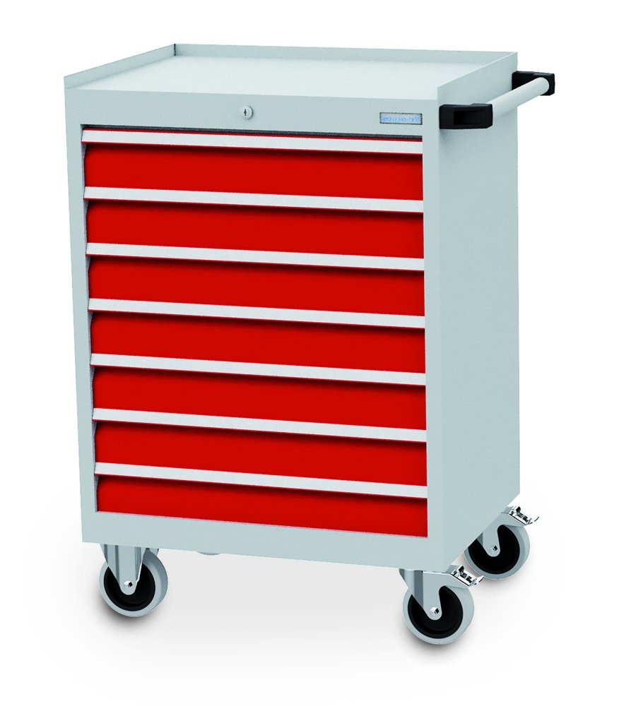 Dielenský servisný vozík, rozmery (V x Š x H) 1004 x 680 x 500 mm. 7x zásuvka 100 mm. 4 otočné kolieska, madlo. Farba konštrukcie svetlo sivá. Farba zásuviek na výber. Dodávaný v zmontovanom stave.