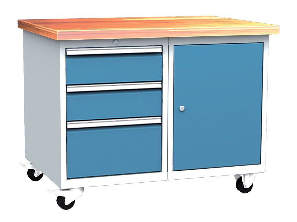 Dielenský servisní vozík, šírka 1050, výška 800, hĺbka 750 mm. Nosnosť korpusu 300 kg, nosnosť zásuvky 80 kg, nosnosť police 60 kg. Výška zásuviek 2x 150, 1x 240 mm. Farba korpusu RAL 7035 svetlosivá.