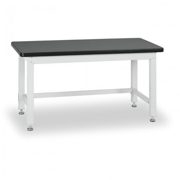 Základný dielenský pracovný stôl, výška 850, šírka 1500, hĺbka 750 mm. Pracovná doska čierna dvojvrstvová MDF doska, hrúbka 40 mm s plastovou hranou, nosnosť stola 1000 kg, farba konštrukcie svetlo šedá RAL 7035.