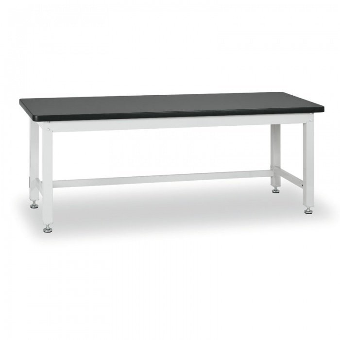 Základný dielenský pracovný stôl, výška 850, šírka 1800, hĺbka 750 mm. Pracovná doska čierna dvojvrstvová MDF doska, hrúbka 40 mm s plastovou hranou, nosnosť stola 1000 kg, farba konštrukcie svetlo šedá RAL 7035.