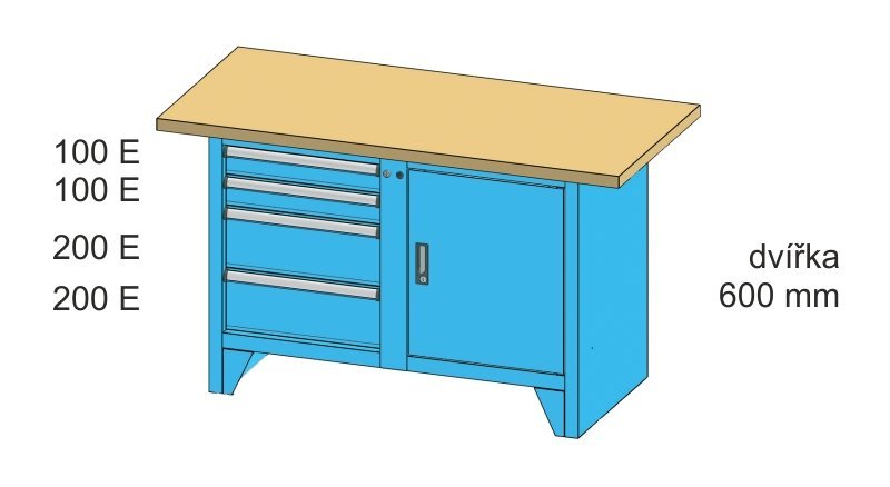 Dielenský stôl, rozmer dosky 1500 x 700 x 40 mm, rozmer korpusu 1198 x 600 x 840 mm. Pracovná doska škárovka buk hrúbky 40 mm alebo buk multiplex (označenie M - vrstvená buková dyha) - hrúbka 40 mm. Nosnosť stola 800 kg.