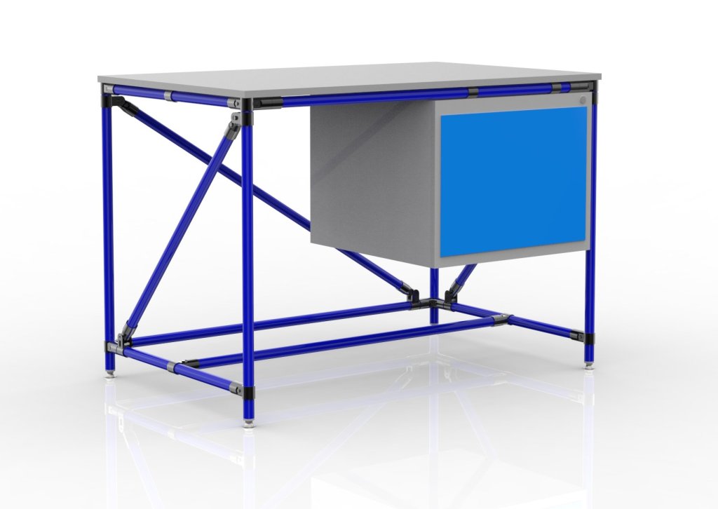 Dielenský stôl z trubkového stavebnicového systému s pracovnou lamino doskou hrúbky 18 mm, stolovým kontajnerom a štyrmi nastaviteľnými nožičkami. Nosnosť pri rovnomernom zaťažení 100 kg. Rozmery 850 x 1200 x 750 mm.