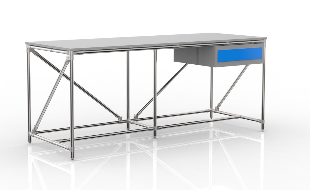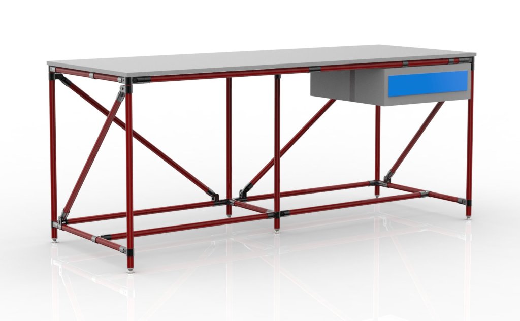 Dielenský stôl z trubkového stavebnicového systému s DTDL pracovnou deskou tloušťky 18 mm, stolovým kontejnerom s jednou zásuvkou a štyrmi nastaviteľnými nožičkami. Nosnosť pri rovnomernom zaťažení 100 kg. Rozmery 850 x 2000 x 750 mm.