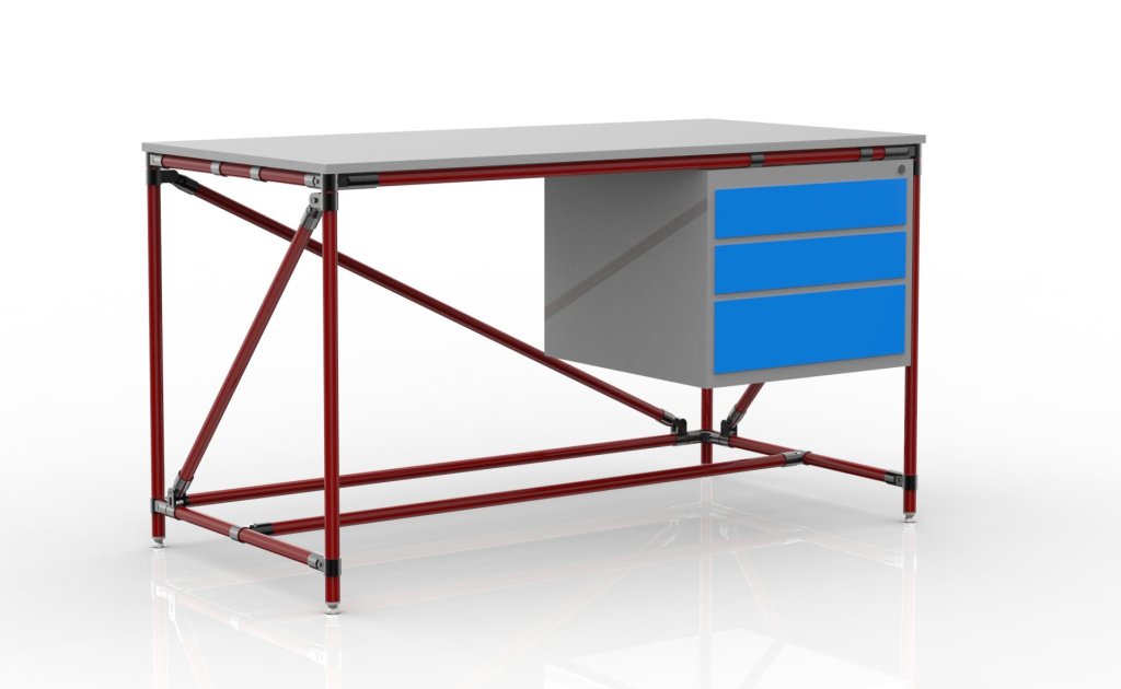 Dielenský stôl z trubkového stavebnicového systému s pracovnou lamino deskou tloušťky 18 mm, stolový kontajner s tromi zásuvkami a celý popis a parametre