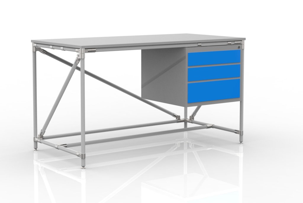 Dielenský stôl z trubkového stavebnicového systému s pracovnou lamino deskou tloušťky 18 mm, stolový kontajner s tromi zásuvkami a štyrmi nastaviteľnými nožičkami. Stôl poskytuje dostatok priestoru na kompletizáciu a balenie objednávok a pod. Nosnosť pri rovnomernom zaťažení 100 kg. Rozmery 850 x 1500 x 750 mm.