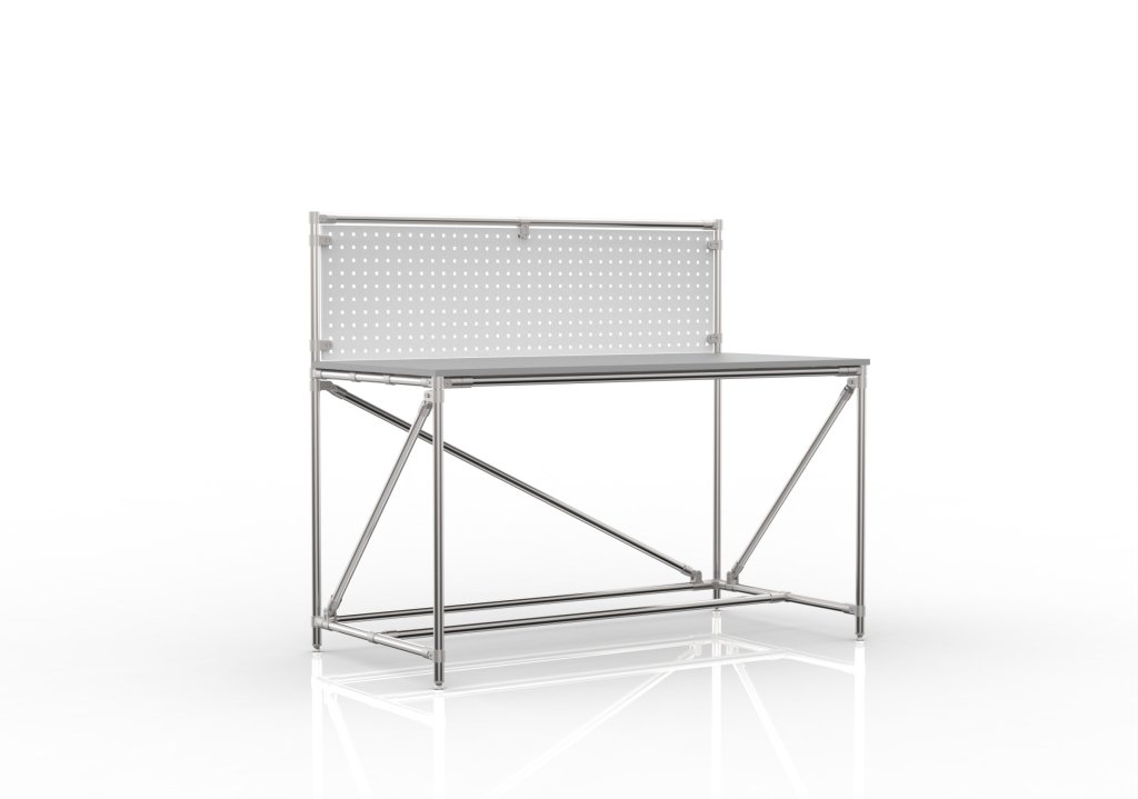 Dielenský stôl s perfopanelom z trubkového stavebnicového systému. Súčasťou stola je drevotriesková pracovná doska obojstranne celý popis a parametre