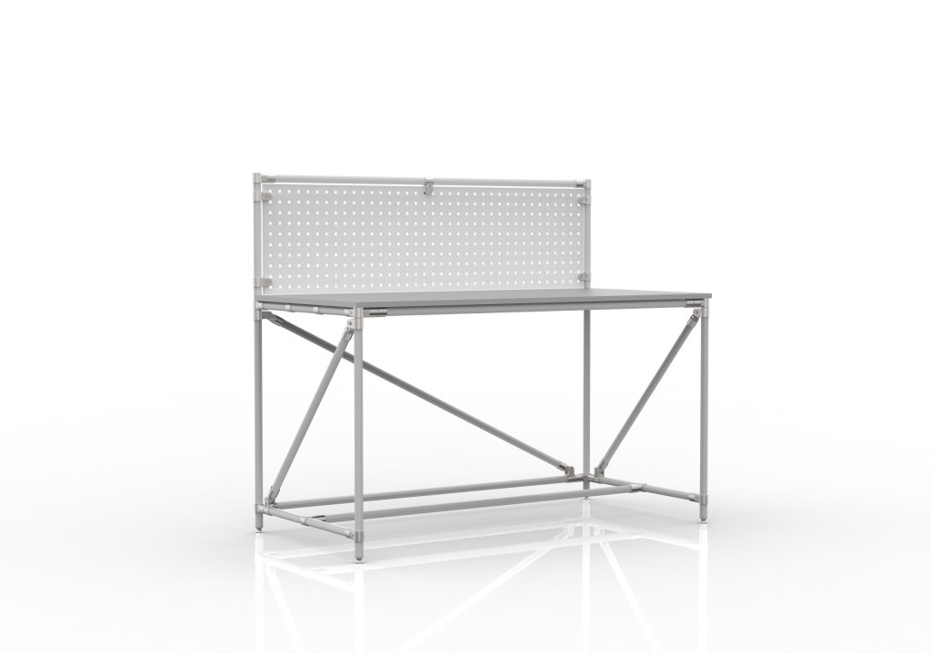 Dielenský stôl s perfopanelom z trubkového stavebnicového systému. Súčasťou stola je drevotriesková pracovná doska obojstranne laminovaná hrúbkou 18 mm, perfopanel na zavesenie náradia či boxov a štyri nastaviteľné nožičky. Nosnosť pri rovnomernom zaťažení 100 kg. Rozmery 1282 x 1500 x 750 mm.