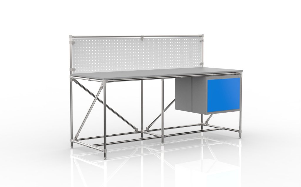 Výškovo nastaviteľný stôl z trubkového stavebnicového systému. Súčasťou stola je lamino doska hrúbky 18 mm, dielenský kontajner, perfopanel na zavesenie boxov či náradia a osvetlenie. Výška pracovnej plochy nastaviteľná v rozmedzí 650 – 950 mm. Nosnosť pri rovnomernom zaťažení 150 kg. Rozmery stola 2100 x 1500 x 700 mm.