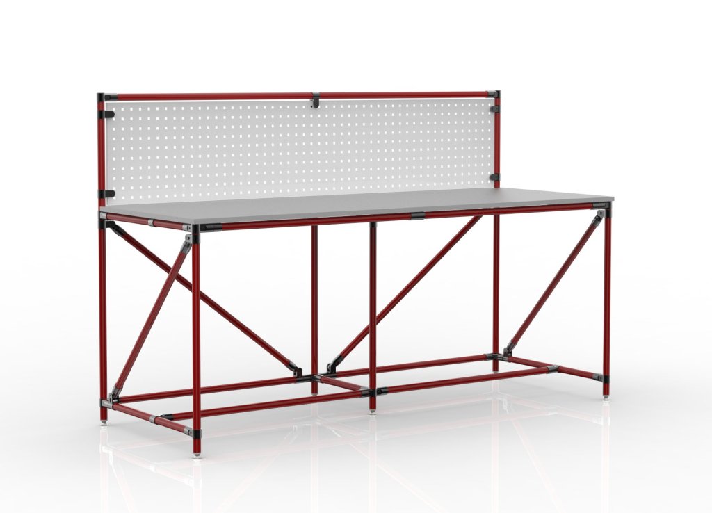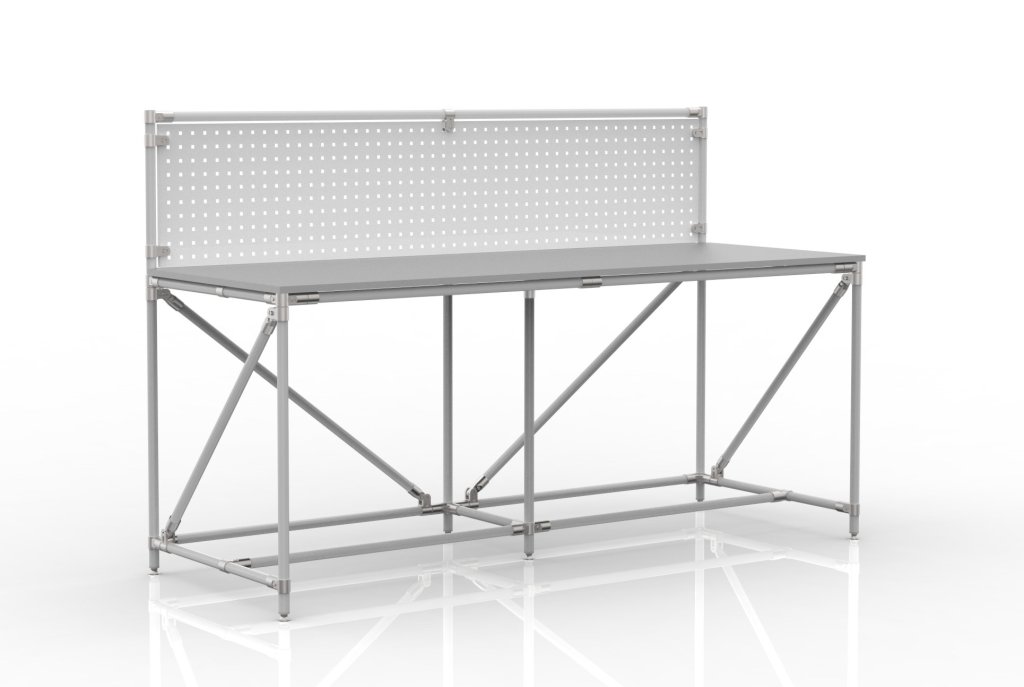 Výškovo nastaviteľný stôl z trubkového stavebnicového systému. Súčasťou stola je lamino doska hrúbky 18 mm, dielenský kontajner, perfopanel na zavesenie boxov či náradia a osvetlenie. Výška pracovnej plochy nastaviteľná v rozmedzí 650 – 950 mm. Nosnosť pri rovnomernom zaťažení 150 kg. Rozmery stola 2100 x 1500 x 700 mm.