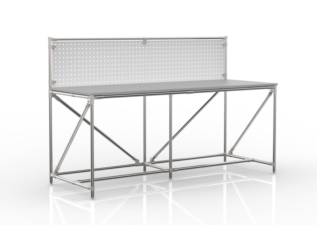 Dielenský stôl s perfopanelom z trubkového stavebnicového systému. Súčasťou stola je drevotriesková pracovná doska obojstranne celý popis a parametre