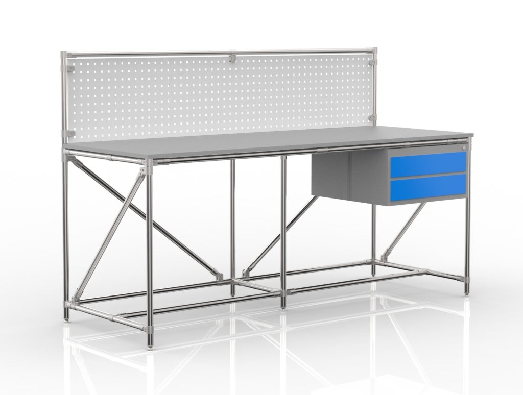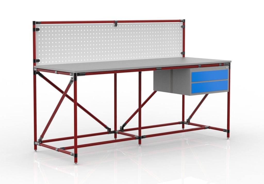 Dielenský stôl s perfopanelom z trubkového stavebnicového systému. Súčasťou stola je drevotriesková pracovná doska obojstranne laminovaná hrúbkou 18 mm, stolový kontajner s dvoma zásuvkami, perfopanel na zavesenie náradia či boxov a štyri nastaviteľné nožičky. Nosnosť pri rovnomernom zaťažení 100 kg. Rozmery 1282 x 2000 x 750 mm.