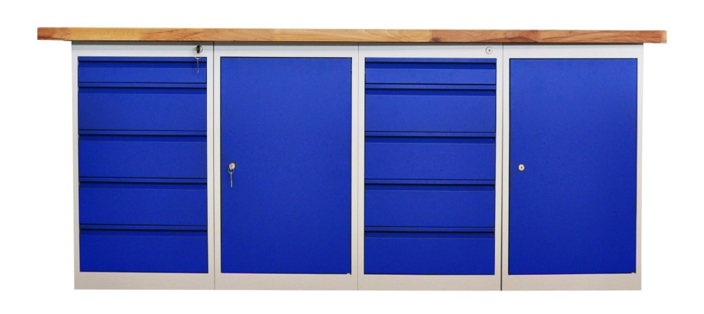 Pracovná doska 40 mm vodovzdorná buková škárovka. 4x podstavný kontajner, výška 810, šírka 461, hĺbka 600 mm. Stôl má nosnosť 500 kg, výšku 850, šírku 2000, hĺbku 750 mm, farba kontajnera sivá RAL 7035/modrá RAL 5010.