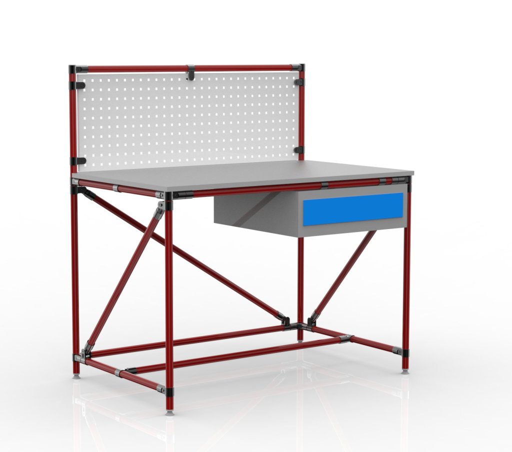 Dielenský stôl s perfopanelom z trubkového stavebnicového systému. Súčasťou stola je pracovná lamino doska, stolový kontajner s jednou zásuvkou, perfopanel a štyri nastaviteľné nožičky. Nosnosť pri rovnomernom zaťažení 100 kg. Rozmery 1282 x 1200 x 750 mm.