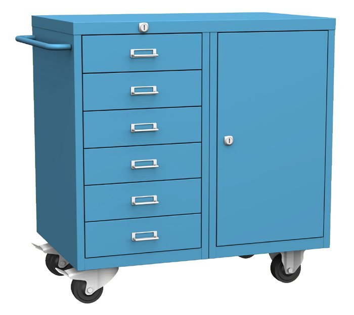Dielenský servisní vozík, šírka 1050, výška 800, hĺbka 750 mm. Nosnosť korpusu 300 kg, nosnosť zásuvky 80 kg, nosnosť police 60 kg. Výška zásuviek 2x 60, 1x 90, 1x 120, 1x 210 mm. Farba korpusu RAL 7035 svetlosivá.
