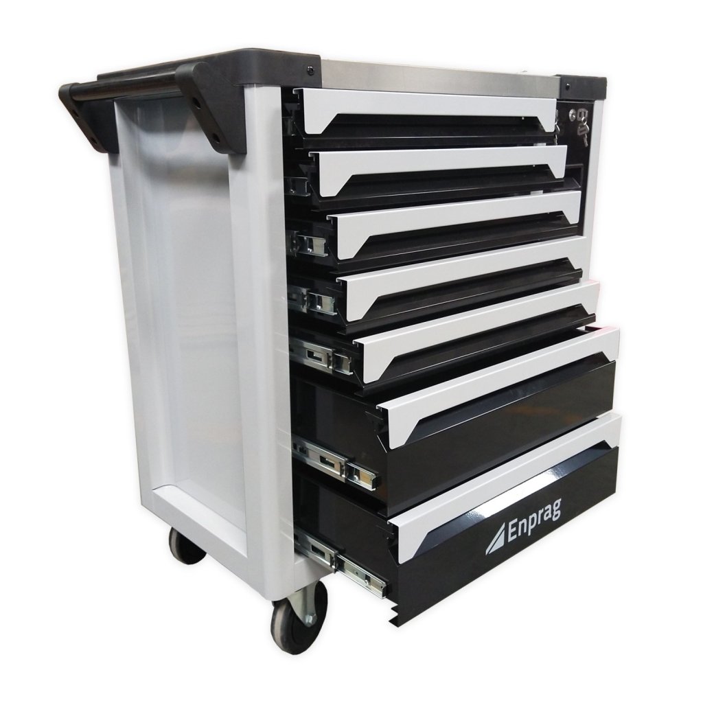 Dielenský servisný vozík - 8x zásuvka + sada 250 kusov náradia v šiestich penových výplniach. Výška 951 x šírka 954 x hĺbka 459 mm. 2 otočné a 2 pevné kolieska, rukoväť. Farba sivá RAL 7040 / čierna RAL 9017.