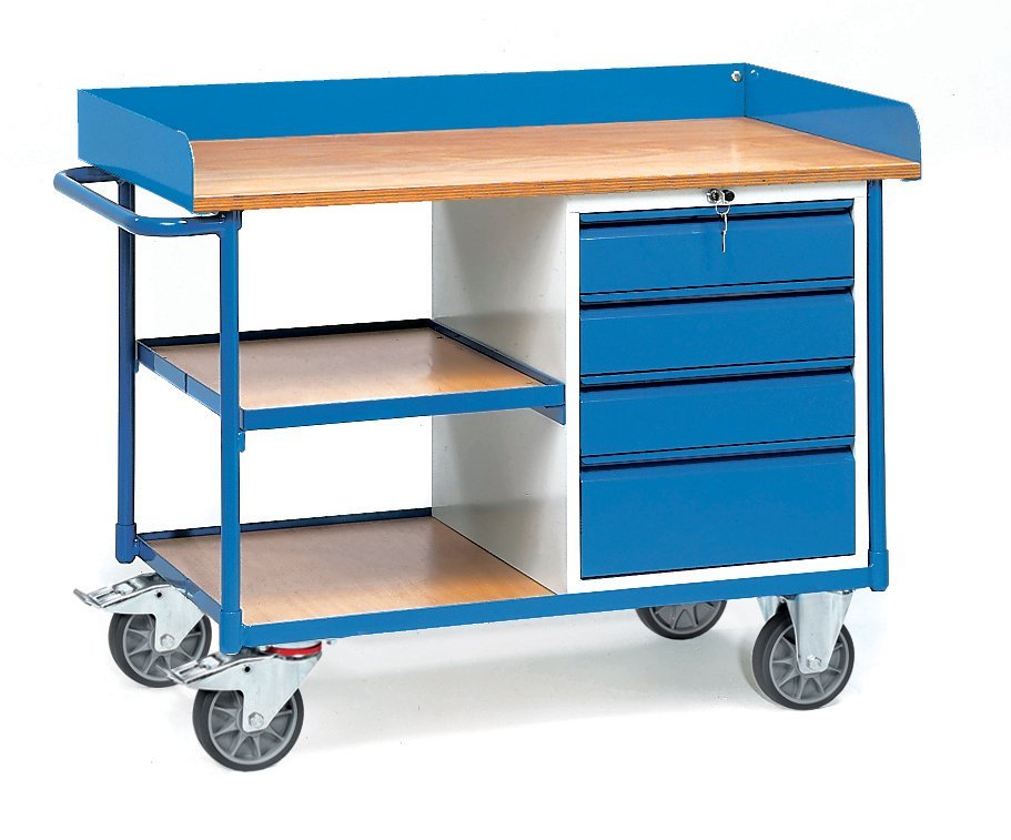 Dielenský pracovný vozík nemeckej výroby, oceľová konštrukcia, pracovná plocha je z preglejky o sile 22 mm, na troch stranách zvýšený okraj s výškou 80 mm. Vozík sa skladá zo skrinky so zásuvkami a prídavné police. 4 špeciálne pneumatické kolieska Fetra TPE, z toho 2 otočné s brzdou, 2 pevné. Totalstop - centrálny brzdový systém Fetra.