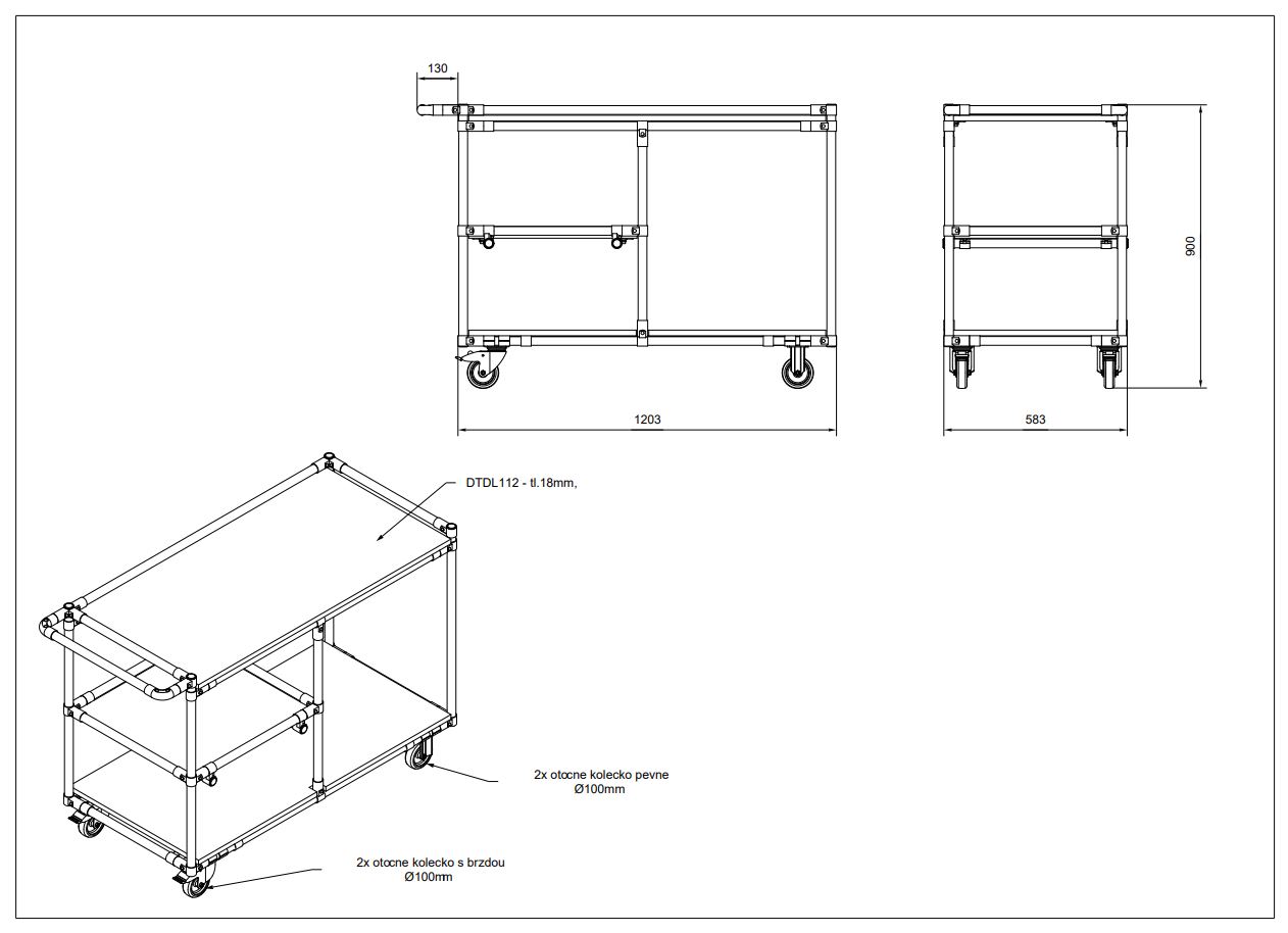 Dielenský pracovný vozík vyrobený z trubkového stavebnicového systému. Tento vozík je vybavený doskou z laminovanej drevotriesky s hrúbkou 18 mm, ktorá poskytuje pevnú a stabilnú pracovnú plochu. Súčasťou vozíka sú štyri kolieska s priemerom 100 mm. Celková nosnosť 250 kg, nosnosť poschodia 100 kg. Rozmer 900 x 1333 x 583 mm.