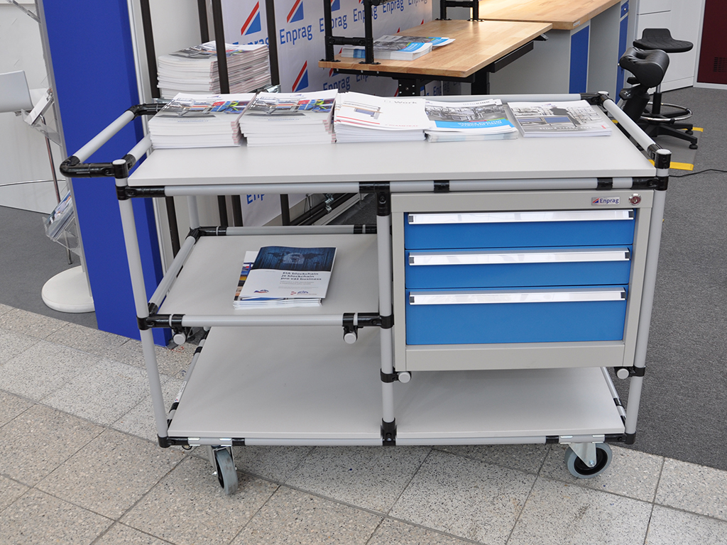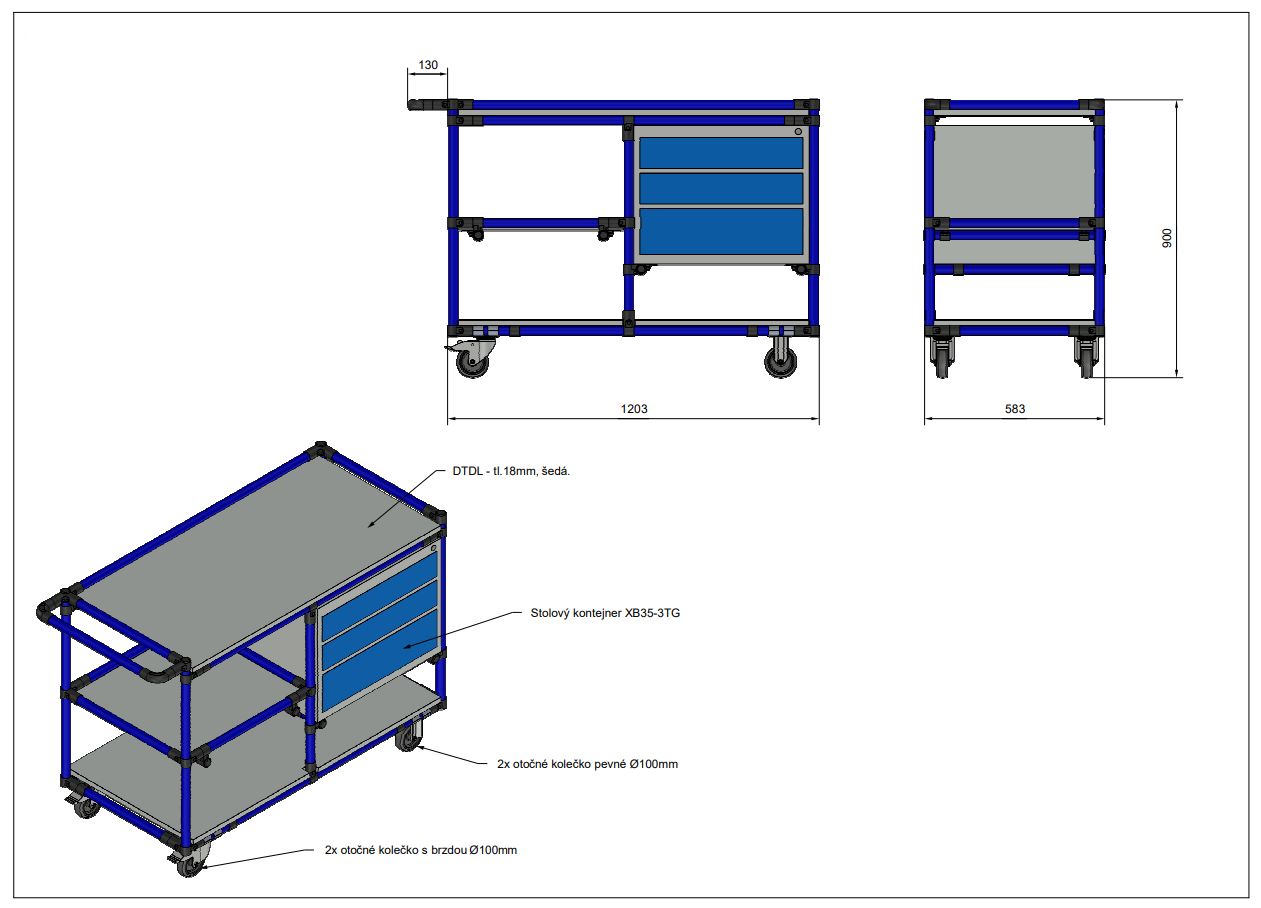 Dielenský pracovný vozík vyrobený z trubkového stavebnicového systému. Tento vozík je vybavený doskou z laminovanej drevotriesky s hrúbkou 18 mm, ktorá poskytuje pevnú a stabilnú pracovnú plochu. Súčasťou vozíka sú štyri kolieska s priemerom 100 mm a dielenský trojzásuvkový kontajner XB35-3TG pre praktické uloženie nástrojov. Celková nosnosť 250 kg, nosnosť poschodia 100 kg.