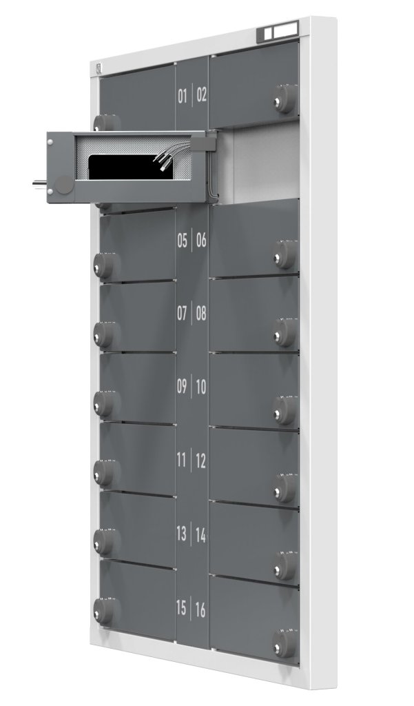Dobíjacia skriňa pre mobilné telefóny, umožňuje dobitie až 16 mobilných telefónov naraz. Výška 1155 x šírka 830 x hĺbka 57 mm. 3 rôzne konektory s bezpečnými dobíjacími káblami - mikro USB, USB-C a Apple lighting. Vnútorný priestor boxov je vyložený 3D textílií pre komfortné uloženie. Zamykanie cylindrickým alebo mincovým zámkom.