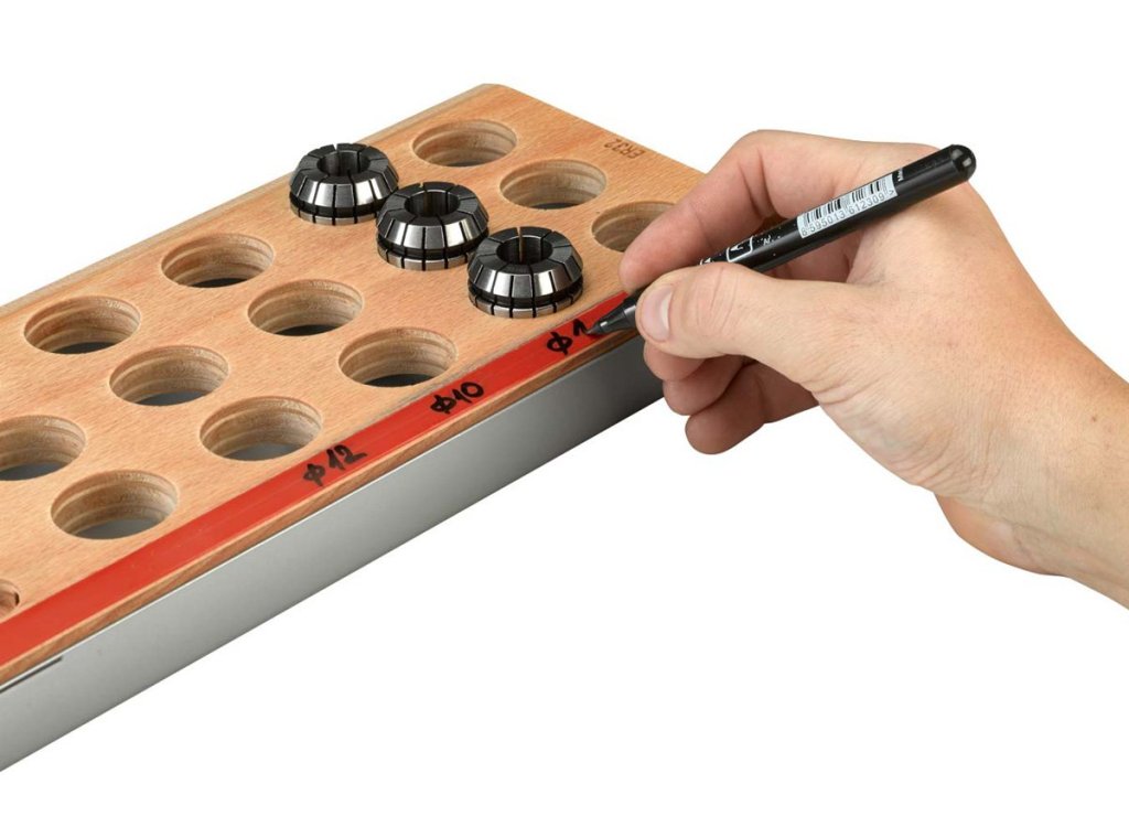 Lihovým popisovačem identifikujete na plastovém štítku ukládané nástroje. Při změně štítek jednoduše setřete lihem a můžete opět psát.