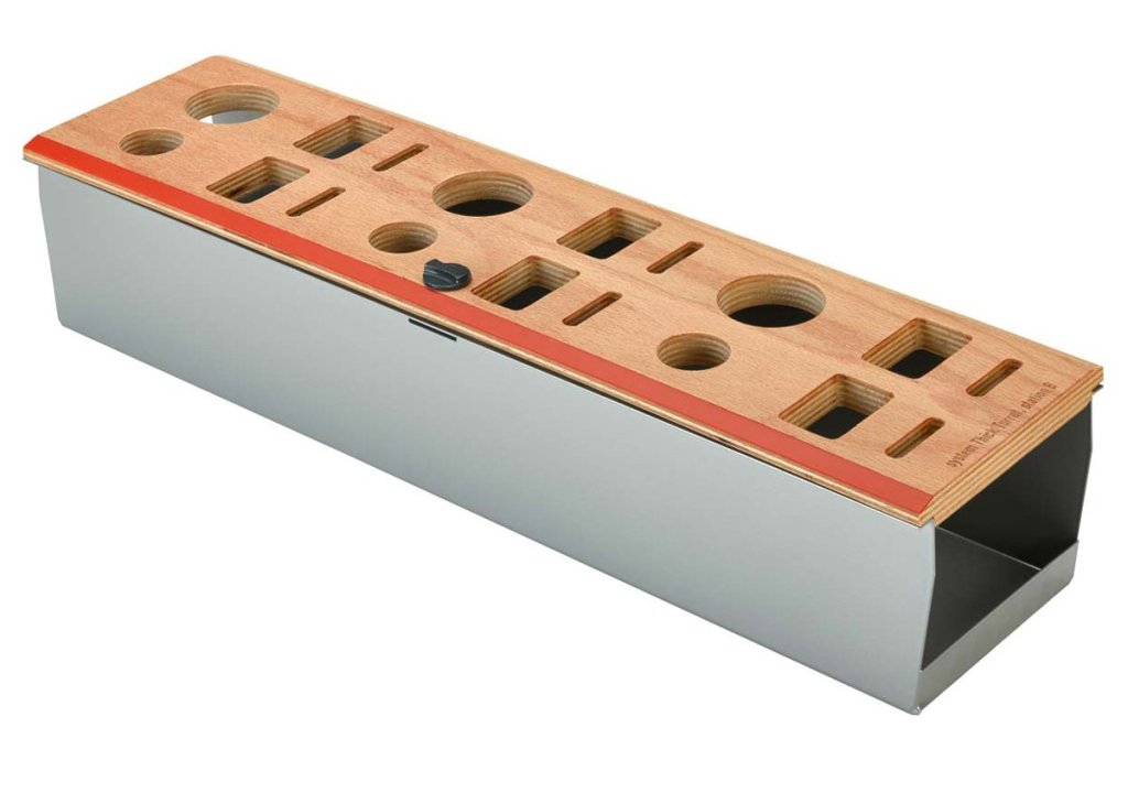 Drevený držiak pre skladovanie dierovacích nástrojov systému Trumpf. Veľkosť 36D, celkový rozmer držiaka (šírka x hĺbka) je 550 x 142 mm. Kompletná zostava dreveného držiaku je ukladaná do nástrojových rámov a nosičov nástrojov.