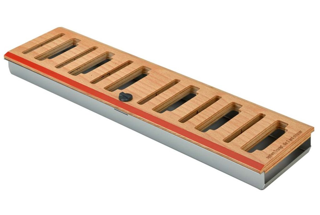 Drevený držiak pre skladovanie dierovacích nástrojov systému Trumpf. Veľkosť 54D, celkový rozmer držiaka (šírka x hĺbka) je 855 x 142 mm, počet pozícií 10 + 10. Kompletná zostava dreveného držiaku je ukladaná do nástrojových rámov a nosičov nástrojov.