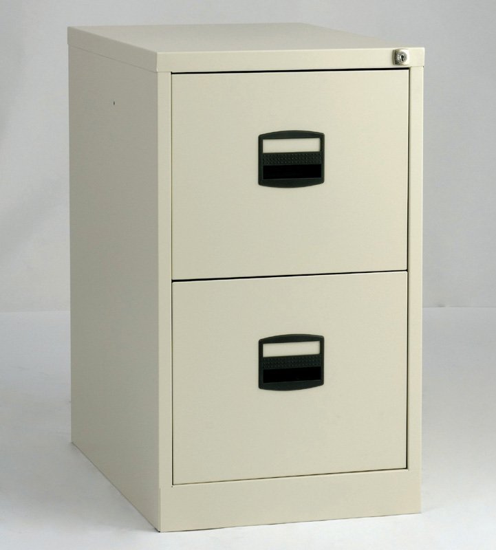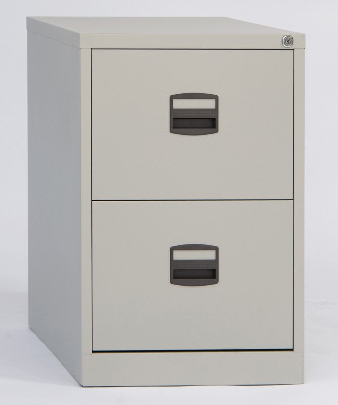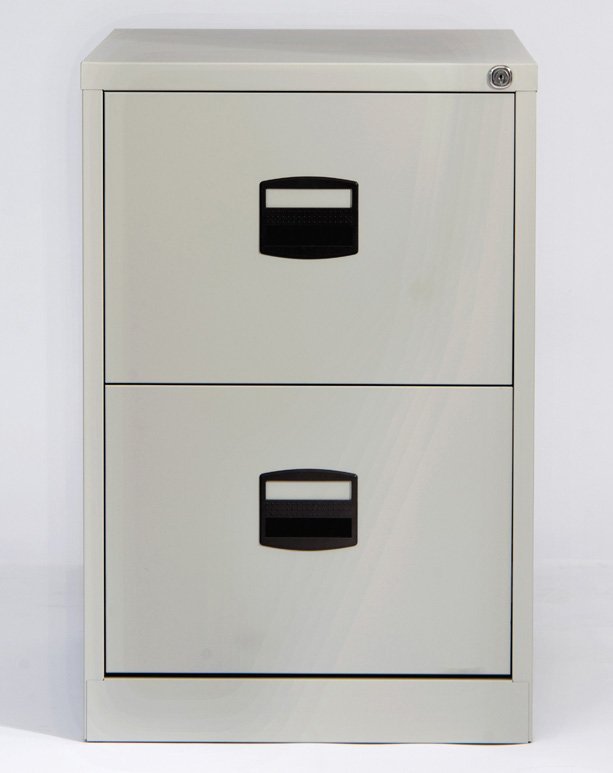 Dvojzásuvková kovová kartotéka pre dokumenty alebo závesné zakladače formátu Foolscap, šírka 470, výška 711, hĺbka 622 mm, centrálny zámok, rôzne farby.