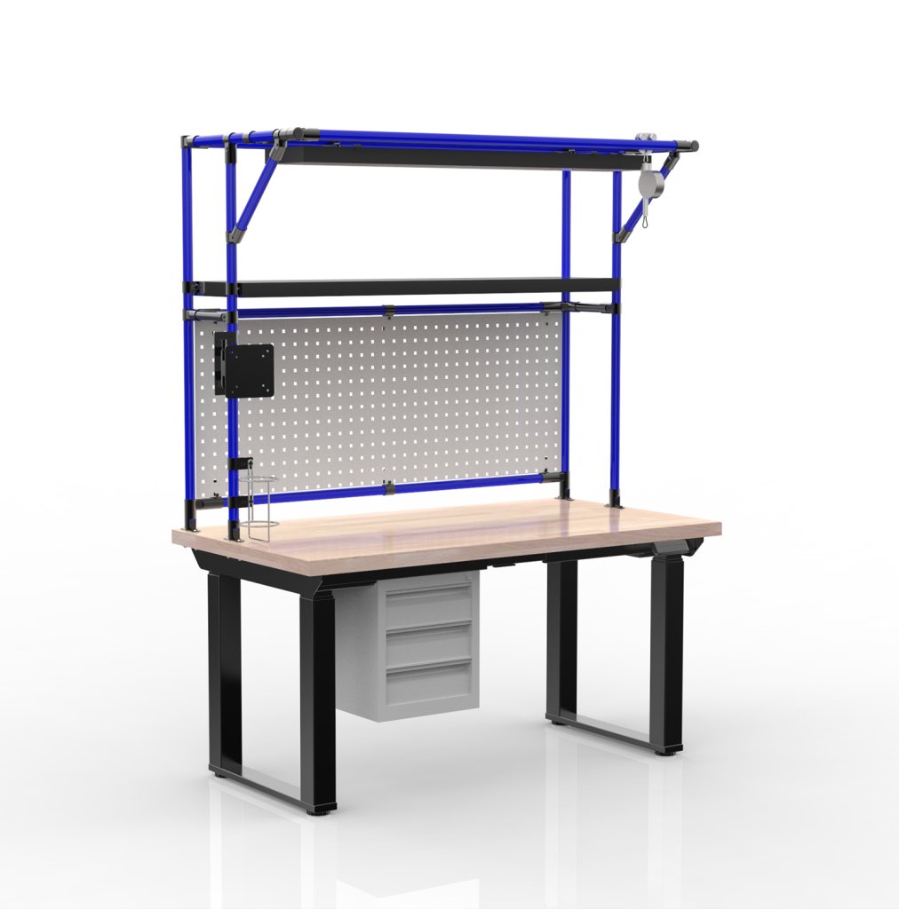 Elektricky výškovo nastaviteľný pracovný stôl s pracovnou doskou z bukovej škárovky. Súčasťou stola je perforovaný panel na zavesenie boxov alebo náradia, kontajner s tromi zásuvkami, pozinkovaná polica, držiak na monitor, držiak na 2l PET fľaše a LED osvetlenie. Výška pracovnej plochy je nastaviteľná v rozmedzí 700 - 1350 mm. Nosnosť pri rovnomernom zaťažení je 250 kg. Rozmery 1800 - 2450 x 1400 x 750 mm.