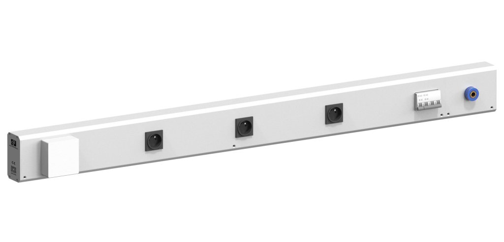 Elektrolišta, 3x zásuvka 230 V / 16A, 1x istič 230V / 16A, 1x zásuvka 400V / 16A, 1x istič 400V / 16A, dodávané bez prívodného kábla (400 V / max 20 A) a pneumatickej hadice, s pneumatickou rýchlospojkou. Šírka 1414 x výška 123 x hĺbka 66 mm.