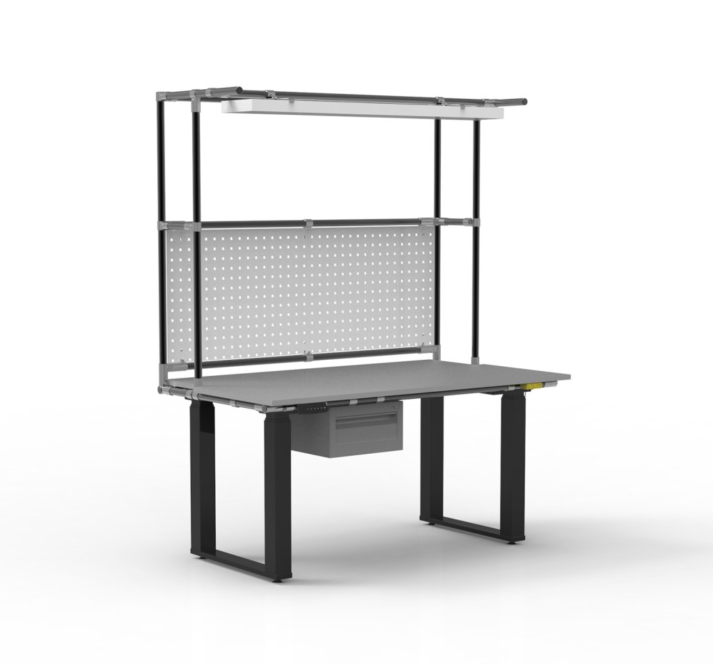 Ergonomický ESD stôl pre elektrostaticky chránené pracoviská s praktickou nadstavbou z rúrkového systému. Súčasťou stola je LED osvetlenie, perfopanel a kontajner s jednou zásuvkou. Stôl je vybavený intuitívnym ovládačom s možnosťou uloženia troch prednastavených výšok, čo uľahčuje ergonomické nastavenie pracovnej plochy v rozsahu 680 – 1330 mm.
