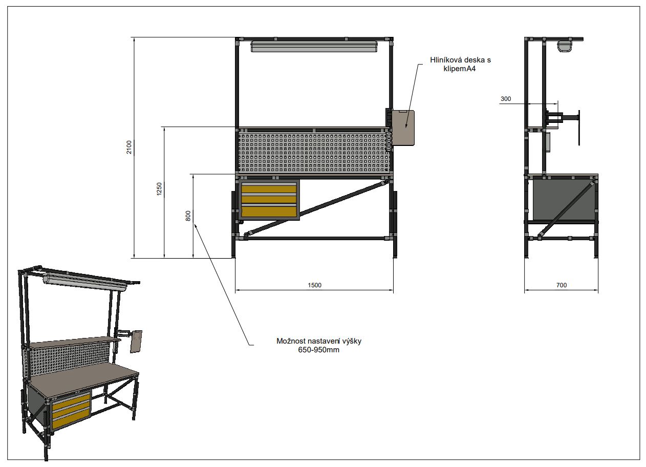 Výškovo nastaviteľný antistatický stôl z trubkového stavebnicového systému. Stôl je vybavený ESD lamino doskou hrúbky 19 mm, ktorá poskytuje spoľahlivú ochranu proti elektrostatickému náboju. Súčasťou je aj ESD kontajner, ESD perfopanel, osvietenie a hliníková doska s klipom A4, ktorá vám umožní udržiavať dôležité dokumenty po ruke. Nosnosť pri rovnomernom zatiahnutí 150 kg. Stôl má nastaviteľnú výšku v rozmedzí 650 – 950 mm. Rozmery 2100 x 1500 x 700 mm.