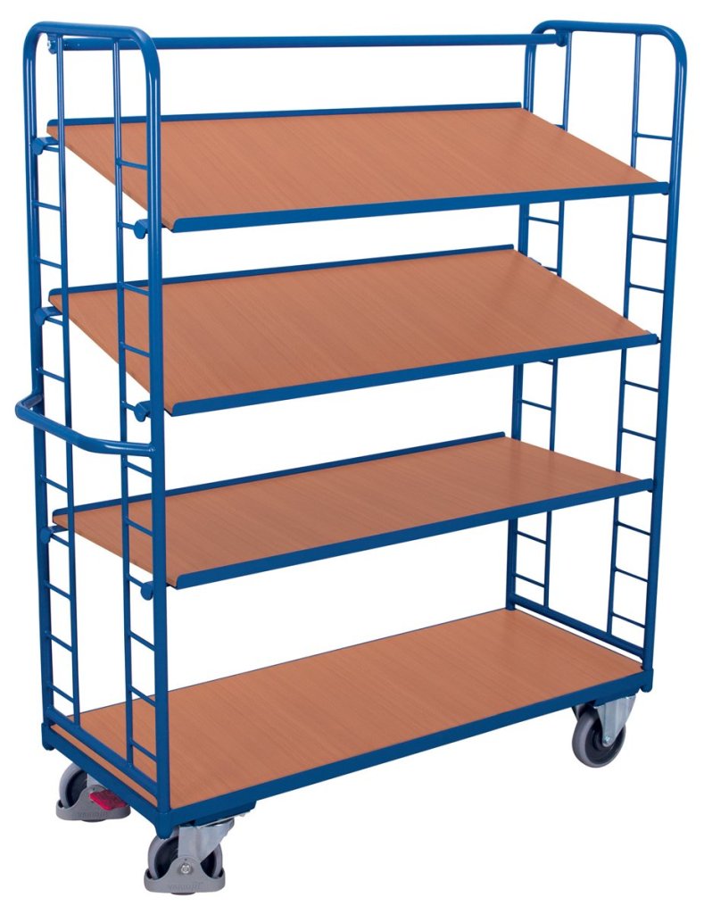 Etážový vozík s šikmými policami. Zváraná oceľová konštrukcia, 4 police. Sklon 15°. Povrchová úprava práškovým lakom 5010 modrá. Vysoko odolná termoplastická kolieska s guličkovým ložiskom (2 otočné s centrálnou brzdou Easy Stop a 2 pevné). Rozmery: výška 1815 x šírka 1510 x hĺbka 550 mm. Ložná plocha 1355 x 550 mm.