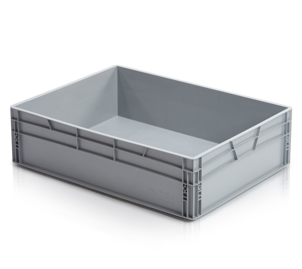 Stohovateľná Euro prepravka vhodná na dlhodobé skladovanie aj do výroby. Je stabilná počas prepravy a kompatibilná s Euro paletami. Má plné dno a steny s uzavretými rukoväťami. Farba sivá. Objem 67 l.