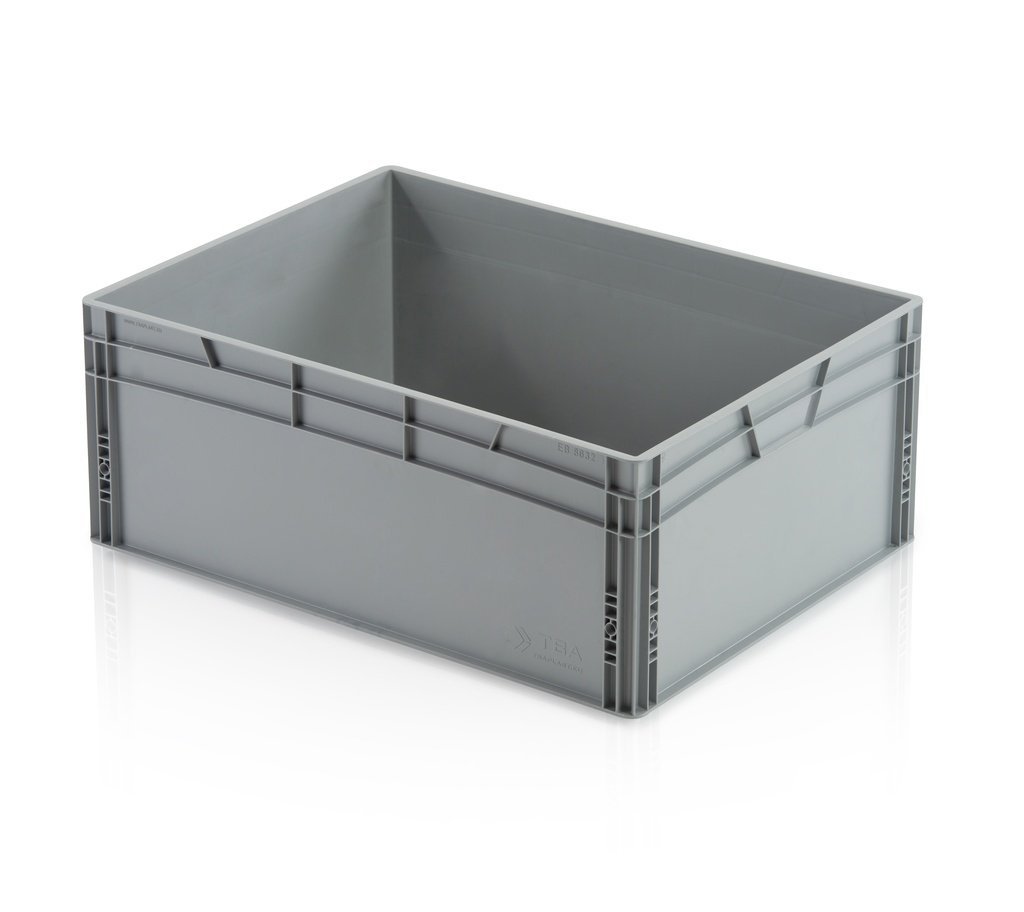 Stohovateľná Euro prepravka vhodná na dlhodobé skladovanie aj do výroby. Je stabilná počas prepravy a kompatibilná s Euro paletami. Má plné dno a steny s uzavretými rukoväťami. Farba sivá. Objem 54 l.