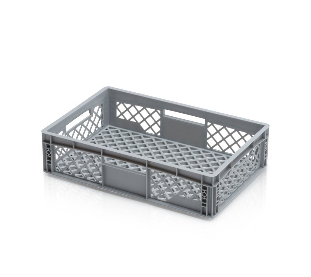 Stohovateľná Euro prepravka vhodná na dlhodobé skladovanie aj do výroby. Je stabilná počas prepravy a kompatibilná s Euro paletami. Má plné dno a steny s uzavretými rukoväťami. Farba sivá. Objem 67 l.