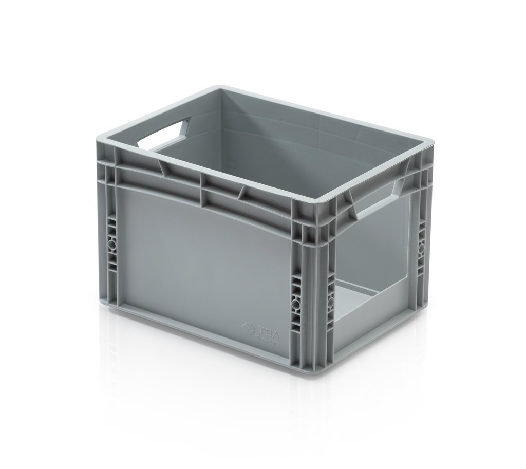 Stohovateľná Euro prepravka vhodná na dlhodobé skladovanie aj do výroby. Je stabilná počas prepravy a kompatibilná s Euro paletami. Má plné dno a steny s uzavretými rukoväťami. Farba sivá. Objem 67 l.
