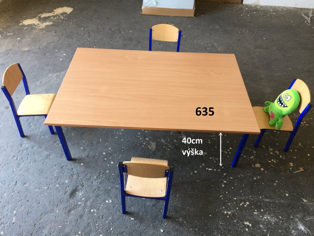 1x stôl - rozmer dosky: 1200 x 800 mm - lamino buk. Rám je vyrobený z trubiek s priemerom 32 mm. Veľkosť stola 0. Farba konštrukcie modrá. Hmotnosť stola cca 20 kg. 4x stolička s podnožou z kovového jeklu 20 x 20 mm. Veľkosť 0. Farba konštrukcie modrá. Sedák a operadlo buková preglejka. Bez područiek. Hmotnosť stoličky cca 5 kg, nosnosť 100 kg. Záruka 2 roky. Nové, zákazník neodobral - 4 sety.