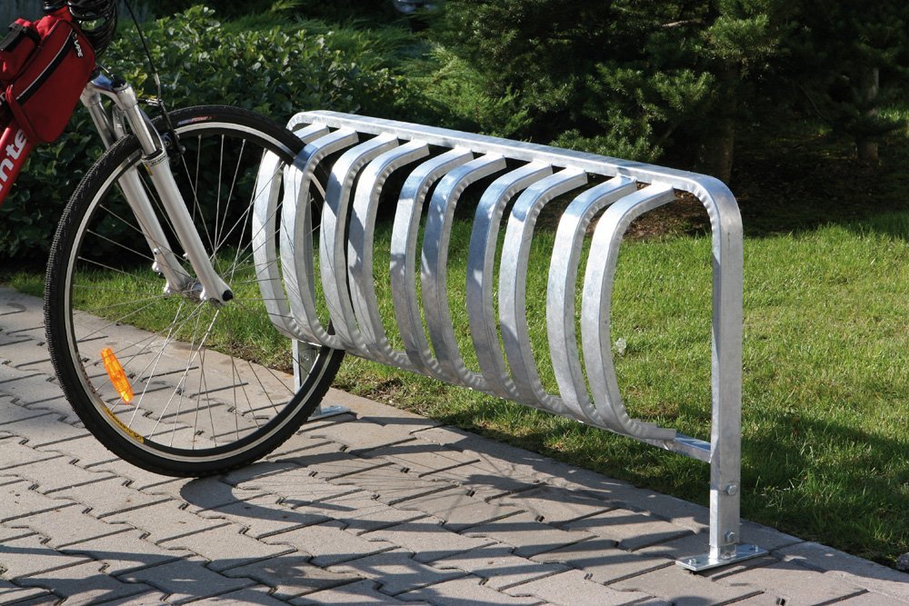 Klasický známy stojan pre 5 bicyklov. Vhodný pre všetky typy bicyklov so všetkými štandardnými rozmermi plášťov. Nosné časti stojanu vyrobené z oceľových profilov. Bicykel je možné uzamknúť cez rám. Rozmery: šírka 1000 mm, výška 760 mm, hĺbka 630 mm, hmotnosť 9 kg, šírka státie 175 mm. Záruka 2 roky.